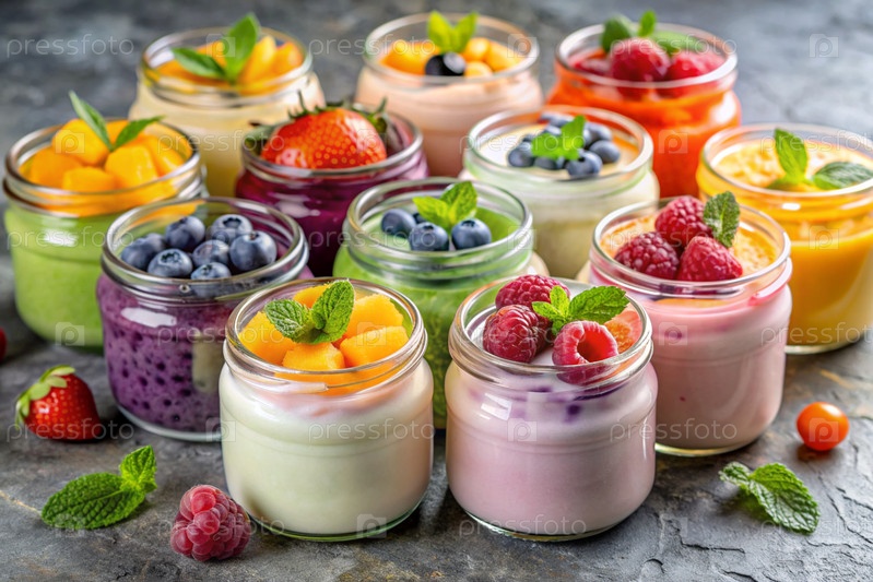 Разнообразный домашний йогурт с различными свежими ягодами и фруктами в стеклянных банках на стильном сером фоне