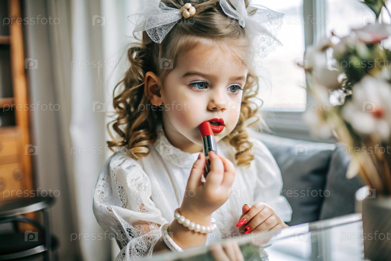 Красивая, забавная девушка в платье рисует губы красной помадой как мама.Девушка играет с женской косметикой