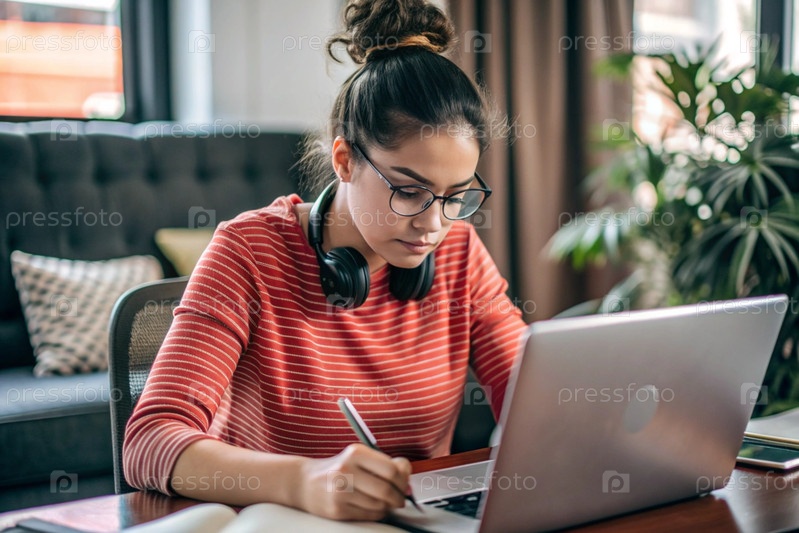 Молодая женщина фрилансер в очках и наушниках работает на ноутбуке или делает покупки в интернет-магазине