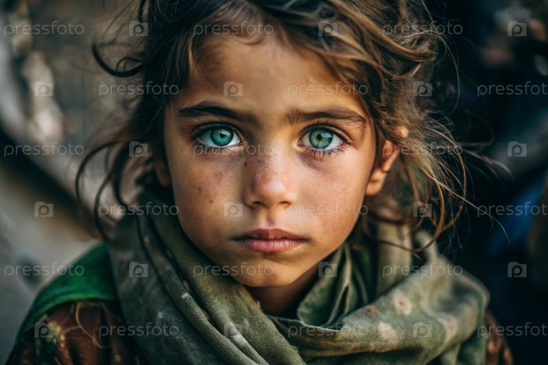 Голод, бедность.Портрет красивой грязной попрошайки с ярко выраженными синими глазами.Голодный бедный ребенок смотрит в камеру