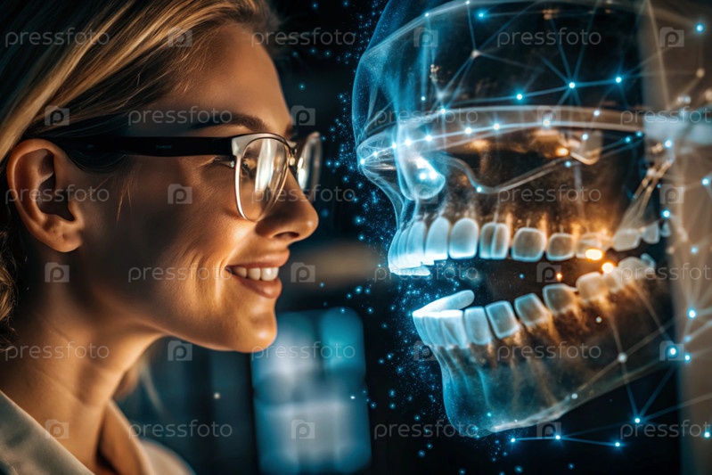 Новые технологии цифрового искусственного интеллекта в зубных протезах. Имплантаты. Женщина-стоматолог с идеальной улыбкой и цифровая графика на виртуальном экране. Концепция стоматологического здоровья и ухода за зубами
