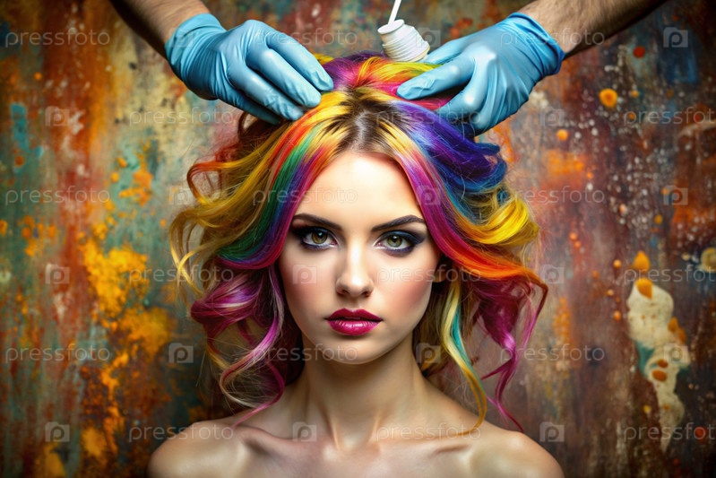 Творческий баннер для салона красоты или парикмахера. Модное профессиональное окрашивание волос. Красивая женщина с длинными многоцветными волосами. Взрыв цветов на голове