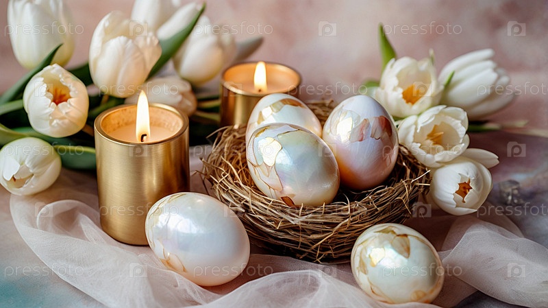 Нежные пасхальные яйца в жемчужной корзине и нежные цветы на пастельно-водном фоне