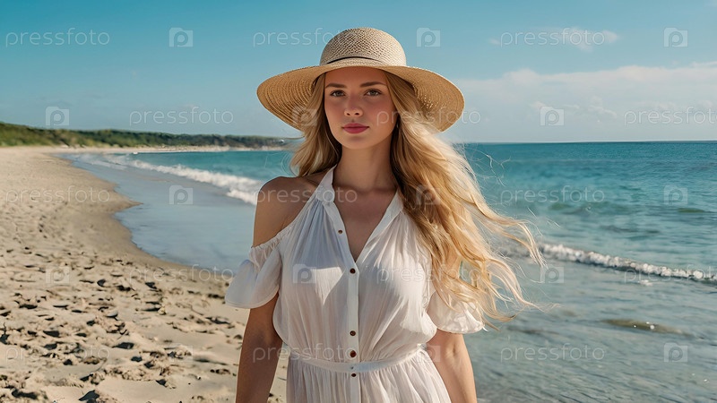 Летние каникулы на пляже, крупный план красивой женщины в соломенной шляпе.Лето. Праздники и праздники, место для копирования