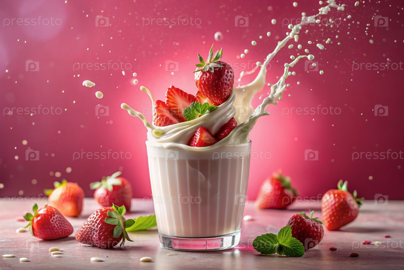 Творческий кулинарный рисунок. ближайшее наполнение клубники, клубника в стакане молока, розовый милкшейк, коктейль йогурта с жидкими каплями на розовом фоне