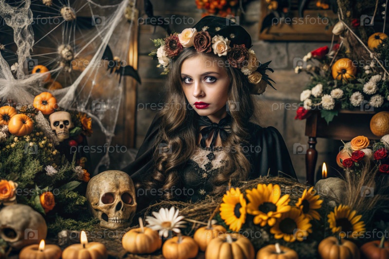 Концепция Хэллоуина. Ужасное. Костюмированная вечеринка. Красивая женщина в костюме ведьмы. Баннер, открытка