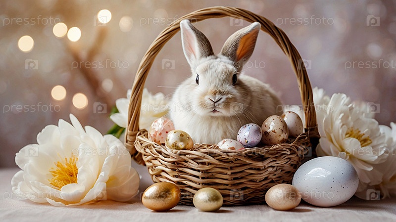 Нежные пасхальные жемчужинные яйца в корзине, кролик и нежные цветы на пастельном аквареле