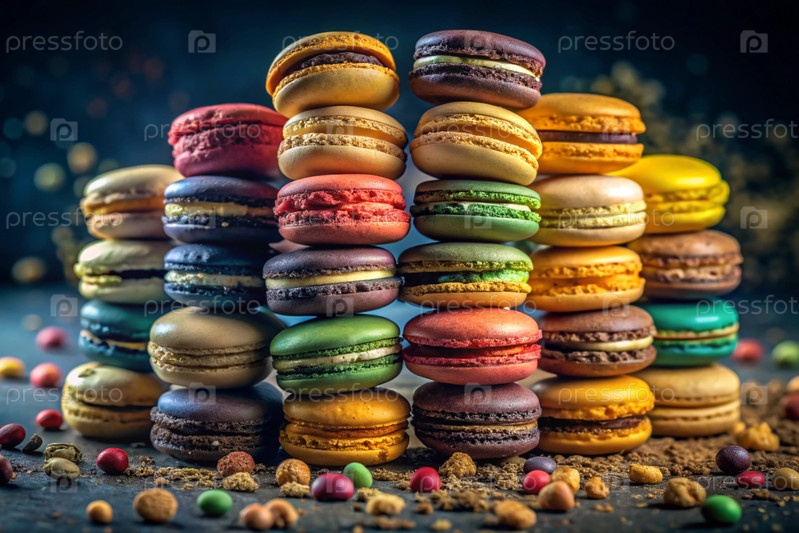 Традиционная яркая французская макароны. многоцветные пасты на темном фоне. вкусный десерт