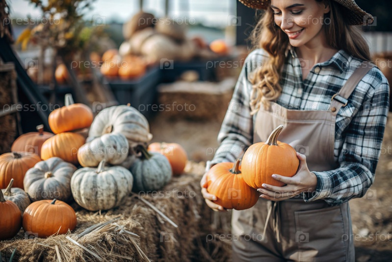 Руки женщины в квадратной рубашке с тыквенным крупным планом и красивым осенним рисунком. Сбор тыков. Концепция празднования Дня благодарения и Хэллоуина