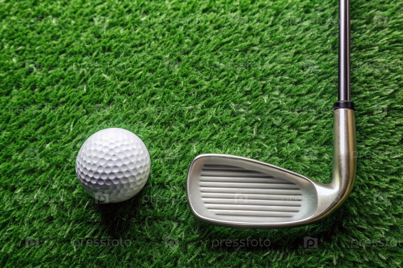 Баннер с видом на зеленую лужайку, на которой лежит белый шар и металлическая клюшка для гольфа. Реклама матча по гольфу в загородном клубе. Свободное место для текста