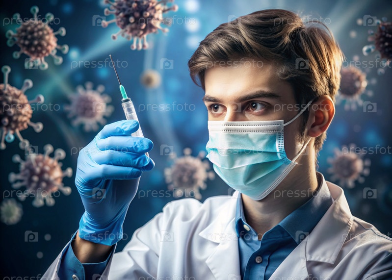 Врач в медицинской маске и защите держит шприц с вакциной на фоне летающих вирусов. Эпидемия, болезнь. Модель опасного летящего вируса, бактерии