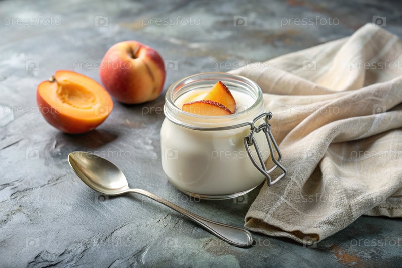 Домашний персиковый йогурт со свежими персиками, винтажной ложкой и полотенцем на стильном сером фоне