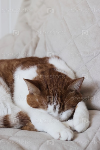 Спящая кошка, Джинджер и белый кот. он заснул с лицом в передних ногах