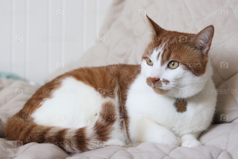 Джинджер и белый кот, лежащие на одеяле с вставленными лапами