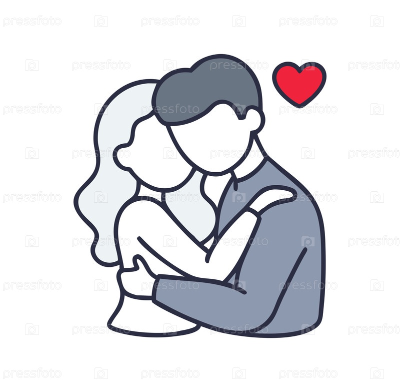 Любящая пара обнимается, празднует романтику и привязанность.Женщина на высоких каблуках обнимает мужчину с красными сердцами