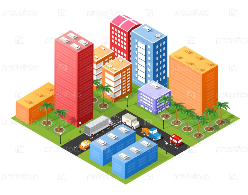 Изометрическая городская метрополия Верхний вид городской инфраструктуры, улица современная, реальная структура, архитектура 3d элементы иллюстрация различных зданий