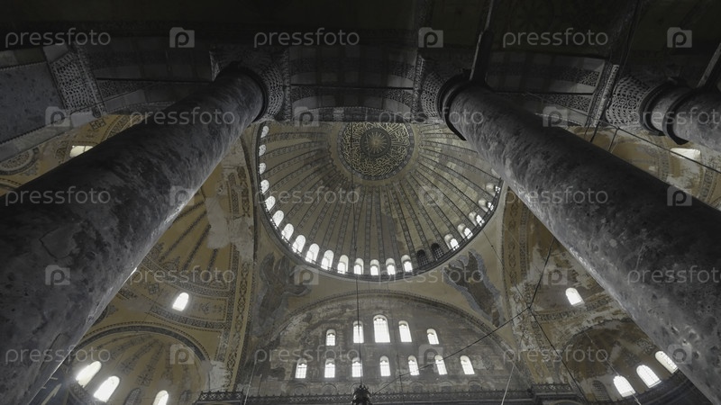 Колонны и свод храма. Продолжайте. Вид снизу на красивое внутреннее крыло купола храма. Интерьер мечети или храма с колоннами