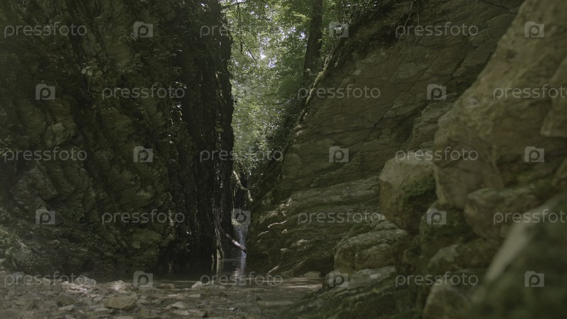 Скалистое ущелье с озером в лесу.Креативно.Небольшое узкое ущелье с водопадом в зеленом лесу.Прекрасное узкое ущелье с водой в лесу летом