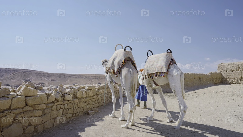 верблюды стоят возле каменного забора, египет. иди дальше. концепция путешествий, красивые животные в песчаной пустыне и голубое небо