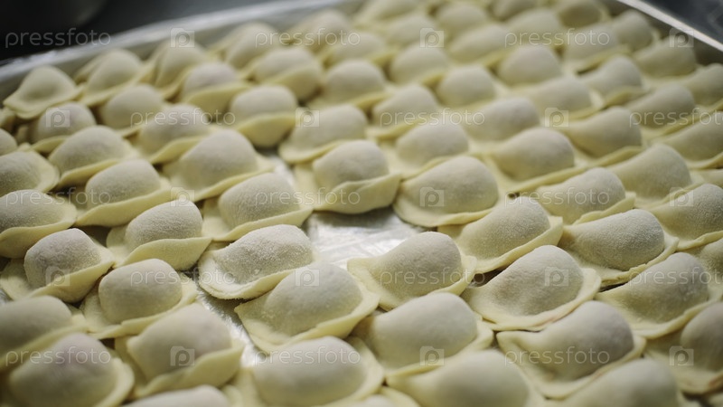 Закрытый ряд пельмени. клип. упаковка свежеприготовленных пельменей. приготовление и моделирование пельмени для промышленной булочки