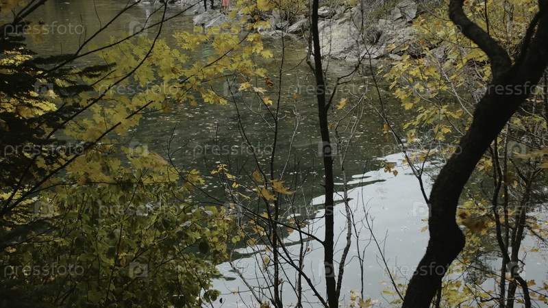 Закройте ветви деревьев на фоне озера осенью.Креативно.Осенние ветки кустарников и деревьев на берегу озера.Прекрасные осенние растения и деревья с озером в лесу