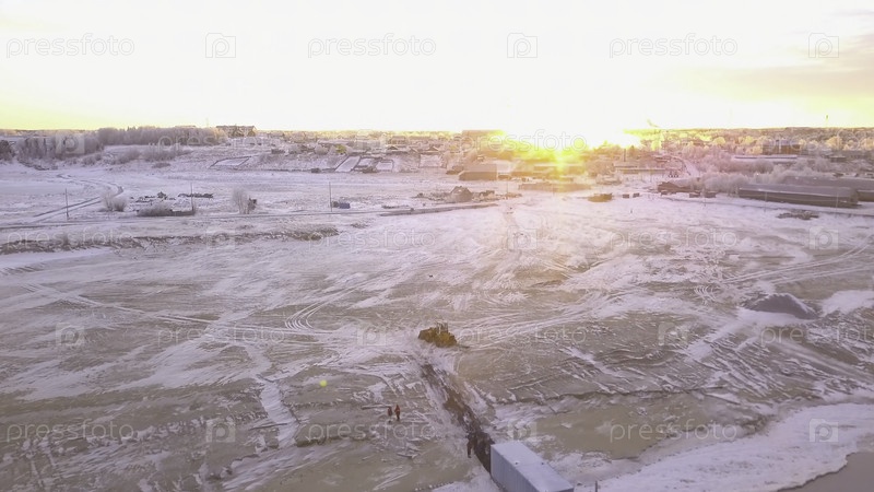 Вид на разгрузку судна зимой. Прекрасный пейзаж разгрузки морского суда на берегу в зимнее утро. Торговое судно, выгруженное на снежном берегу посреди рассвета