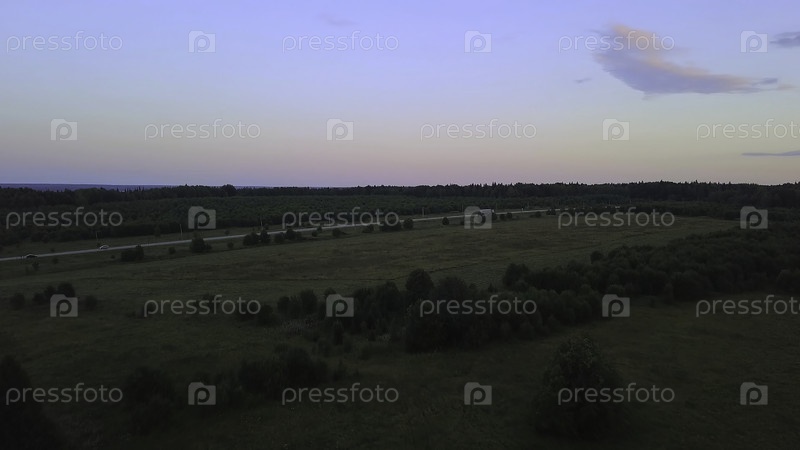 Летний пейзаж с беспилотника. Клип. Зеленое поле с небольшими кустарниками рядом со дорогой, по которой идет один автобус и за лесом и светлым слегка фиолетовым небом