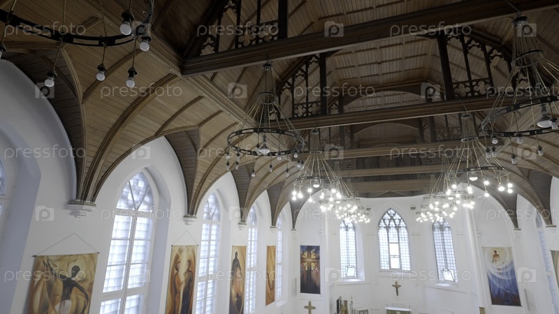 Красивый церковный интерьер с белыми стенами и деревянным потолком