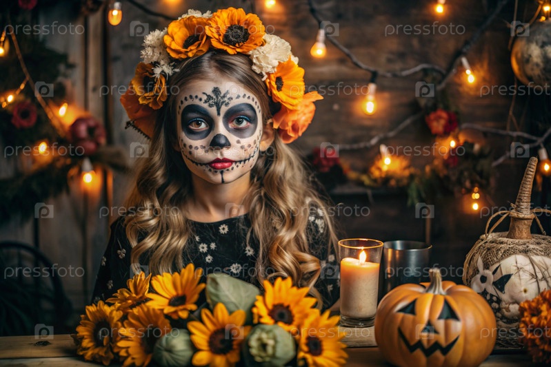 Концепция Хэллоуина. Ужасно. Костюмированная вечеринка. Красивая женщина с покрашенным черепом на лице и цветами на голове. Баннер, открытка
