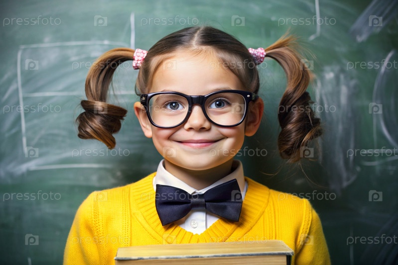 Красивая девушка с очками и книгами. Ребенок впервые ходит в школу. Ребёнок в классе с доской на заднем плане. Возвращение к школе