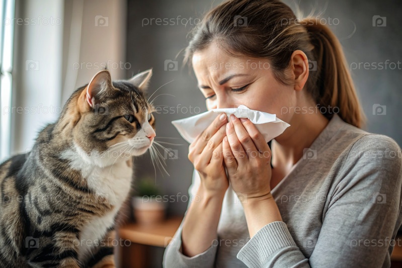 Женщина чихает в белую салфетку дома. Аллергия на волосы кошек и домашних животных. Рядом со мной кот