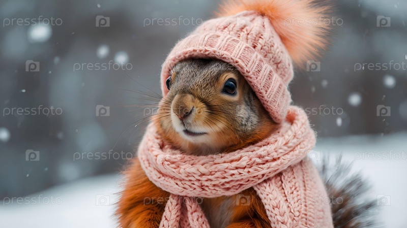 белка с большими щеками, одетая в уютную мягкую розовую тёплую одежду, шляпу и шарф на зимнюю тематику