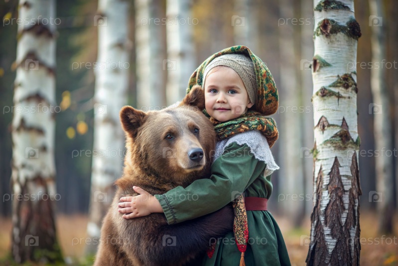 Красивая маленькая девочка в русской народной одежде и с платками на голове в березовой роще с живым медведем Русский фольклор, славянская мифология