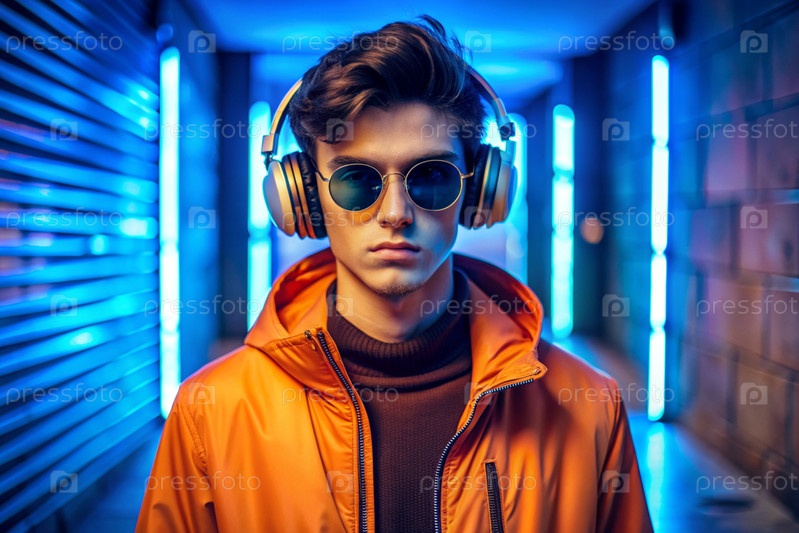Молодой красавец в солнцезащитных очках слушает музыку на больших беспроводных наушниках, стоя среди неоновых вывесок