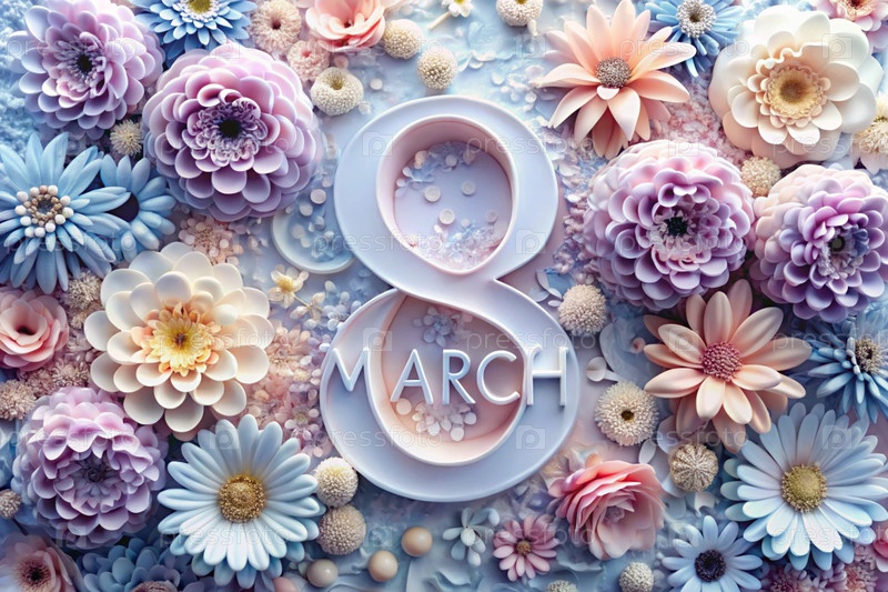 Международный женский день. Баннер, флаер. Праздничный, нежный цветочный фон в голубых и розовых тонах с номером 8