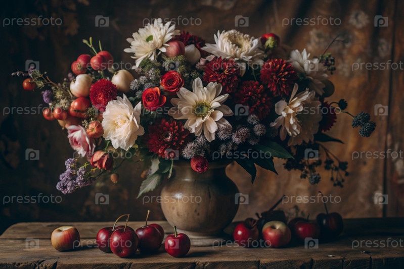 Красочное лето, осенний букет цветов различных красных, розовых, белых оттенков в вазе и спелые красные яблоки на столе