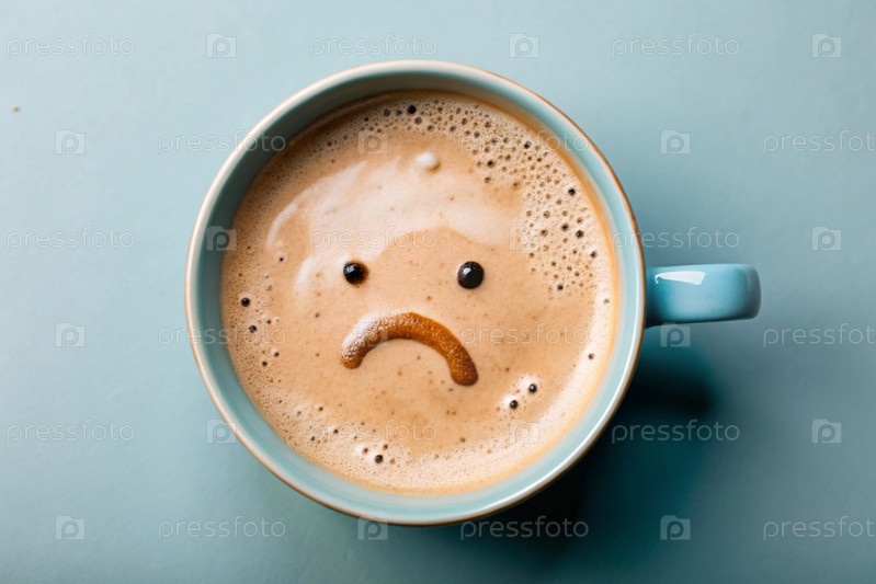 Чашка кофе с грустным улыбающимся лицом на пену на синем столе