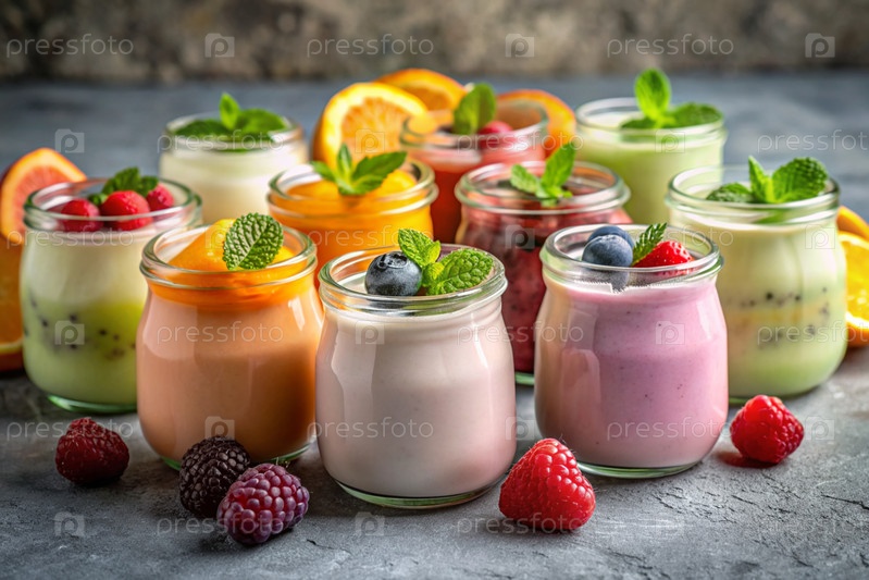 Разнообразный домашний йогурт с различными свежими ягодами и фруктами в стеклянных банках на стильном сером фоне