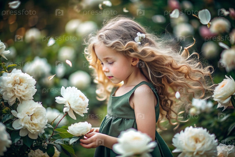 Портрет красивой маленькой кудрявой 4-летней девочки в соломенной шляпе и платье в цветущем саду пиоников. Детство. Ребенок позирует и смотрит на камеру