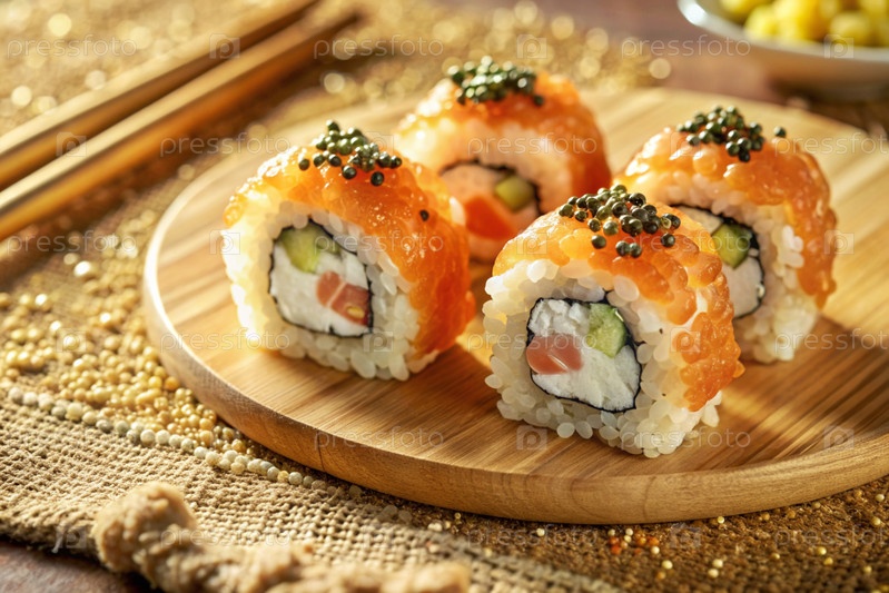 Японская еда. Суши-роллы Калифорния, Филадельфия с угорьем, красной икры и лососем. Концепция меню суши-бара