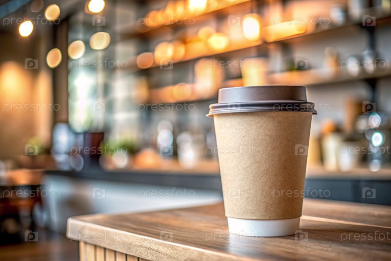 Экологически чистый бумажный стакан для одноразового использования с кофе на столе против размытого фона кофейни