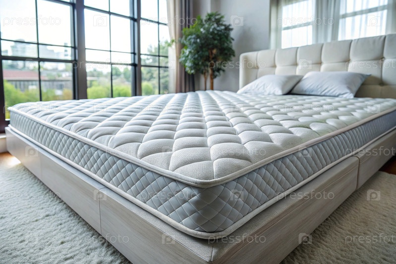 Новый белый роскошный комфортабельный ортопедический матрас на кровати в светлой спальне