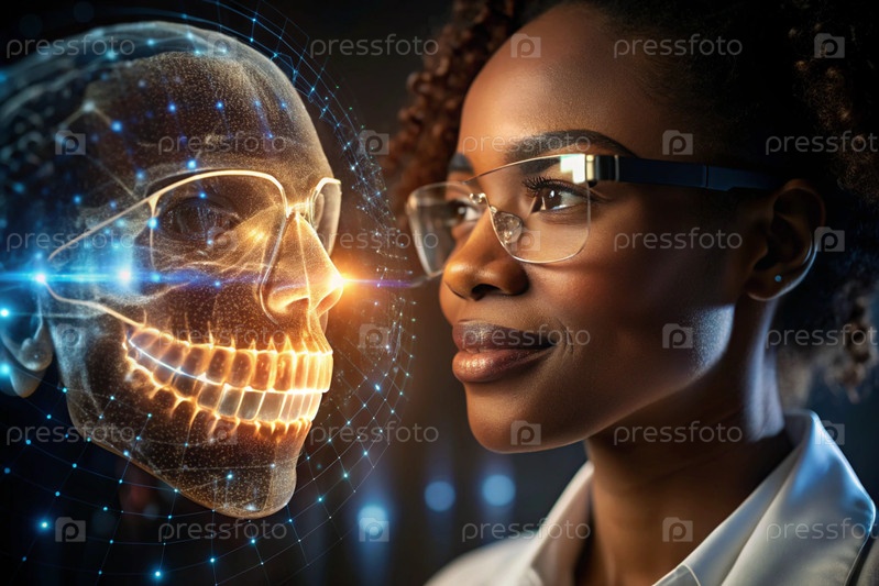 Новые технологии цифрового искусственного интеллекта в зубных протезах. Имплантаты. Чернокожая женщина-стоматолог с идеальной улыбкой и цифровой стоматологической графикой на виртуальном экране. Концепция здоровья зубов и ухода за зубами