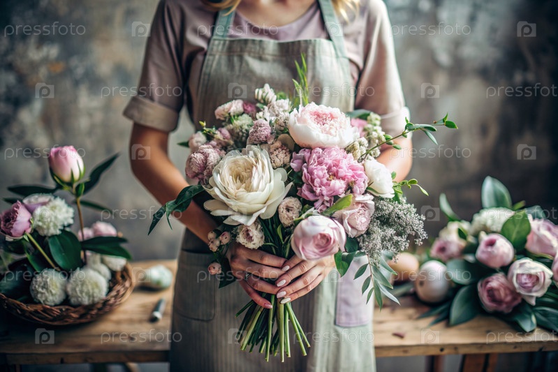 Малый бизнес. Декоратор цветочной лавки держит для покупателя красивый деликатный букет пионьев. Цветочный дизайн. Доставка цветов, обработка заказов