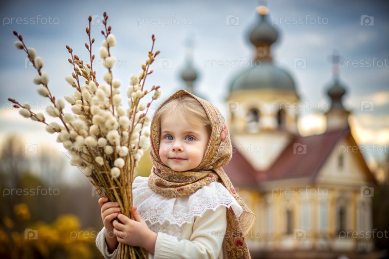 Пальмовое воскресенье. христианство. портрет трехлетней девочки в русском народном шале с ветвями ивы в руках на фоне православной церкви