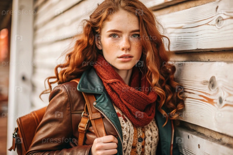 Осенний портрет. Близкий план молодой рыжеволосой женщины с выразительными зелеными глазами в коричневом кожаном куртке и бирюзовом шарфе