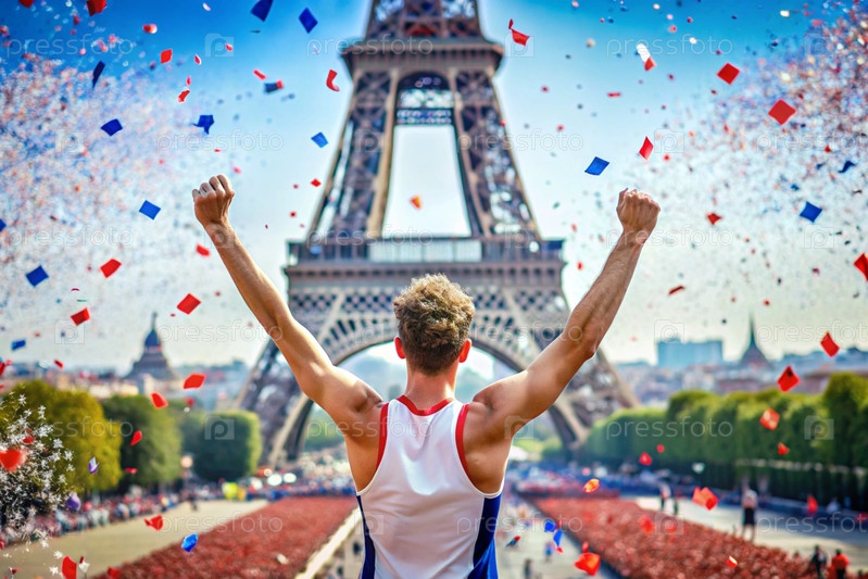 Атлет по легкой атлетике побеждает во время марафона или гонки на фоне Эйфелевой башни на спортивном мероприятии
