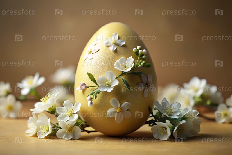 Концепция яркого пасхального праздника минималистична. Пасхальное желтое яйцо с нежными белыми вишневыми цветами на тонком жёлтом фоне