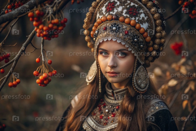 Красивая девушка в традиционном русском национальном костюме. на фоне елок. портрет символизирует традиции и красоту русского народа
