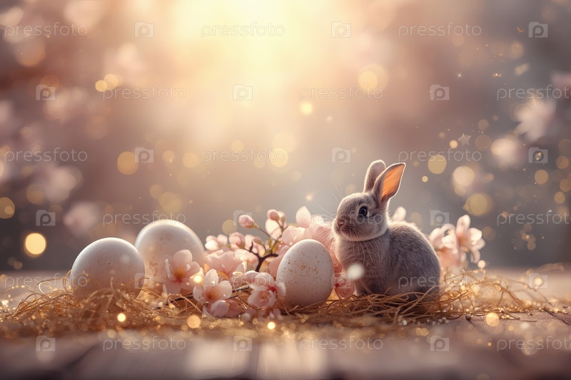 Концепция яркого пасхального праздника в 2026 году.Концепция ярких пасхальных праздников.Нежные розовые пасхальные яйца, кролики и вишневые ветви на деревянном фоне